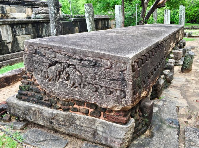 Juste en face de ce premier sanctuaire se dresse le Hatadage (ci-dessous), construction plus modeste qui a toutefois conservé une paire d'inscriptions datant du règne de Nissanka Malla, et un trio de bouddhas, dont la statue centrale s'aligne parfaitement sur l'entrée du Vatadage. Le livre de pierre (deuxième photo), bloc de pierre de huit mètres de long, qui est situé à deux pas du Hatadage vante en 4500 caractères et sur trois pages les mérites et hauts faits du vaniteux roi Nissanka Malla (qui fit transporter jusqu'ici ce bloc de granit depuis Minhintale à 100 km de là!)