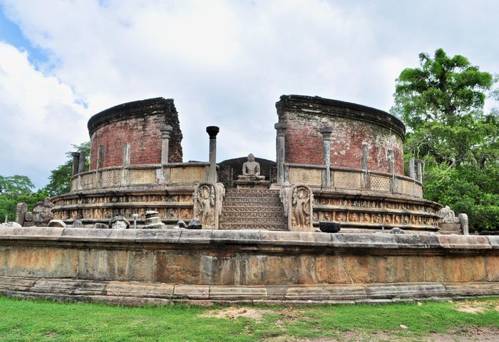 Le site autorise la visite en voiture tandis que d'autres ont choisi de parcourir l'endroit à vélo, c'est selon. Et Chaminda de se diriger vers le Quadrilatère, terrasse de la relique de la Dent sacrée, ou « Dalada Maluwa », au cœur de la cité historique. Là s'élevait le quartier le plus sacré de la ville car il abritait la relique de la Dent ainsi que les plus importants sanctuaires religieux : le plus imposant d'entre eux reste le Vatadage (ci-dessous), érigé sous le règne de Parakramabahu puis embelli par Nissanka Malla. Ce bâtiment circulaire est peut être celui qui est le plus richement décoré du Sri-Lanka avec ses murs extérieurs garnis de frises de lions, de génies et de lotus, pendant que pierres de lune et gardiens de pierre matérialisent chacune des quatre entrées. Des marches conduisent au sanctuaire central présidé par quatre bouddhas, là où la Dent a peut être été déposée pour un temps.