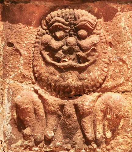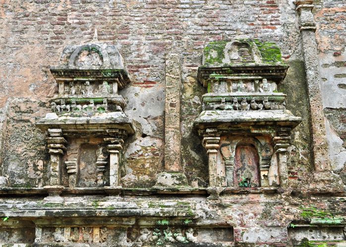 Les murs extérieurs du Lankatikala offrent aussi de délicats reliefs sculptés (ci-dessous) représentant d'extravagantes maisons à étages coiffées de dômes, qui ne correspondent pas à une illustration de ce qu'était jadis Polonnaruwa, comme certains le prétendent, mais à une représentation imaginaire des vimana, les demeures célestes des dieux.