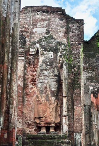 Je note, juste à côté, la présence d'une haute bâtisse, dont les murs se dressent à seize mètres de hauteur. Il s'agit là du Lankatikala (ci-dessous), qui abrite encore de nos jours un énorme bouddha debout (deuxième photo) et sans tête, qui remplit l'étroit espace qui lui est affecté au fond du sanctuaire.