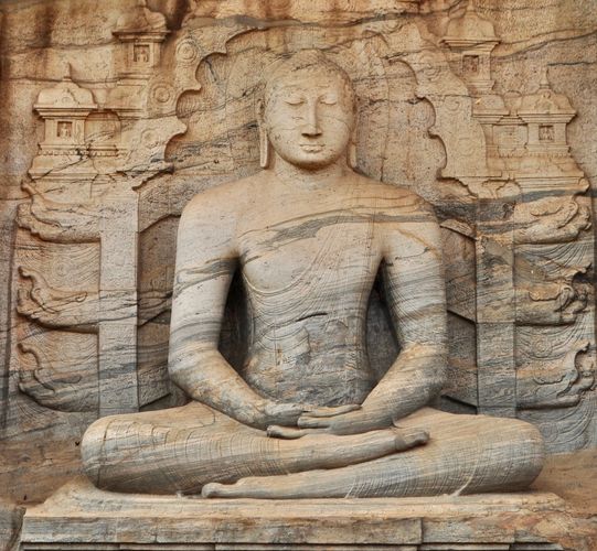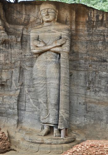 Plus tardivement, deux autres statues seront ajoutées aux premières : sous le règne de Parakramabahu, un bouddha assis en méditation (ci-dessous), avec les jambes croisées, et devant une série de vimana (demeures célestes) en relief fut taillé dans la falaise, tout comme un autre bouddha (deuxième photo) assis au creux d'une niche taillée dans la roche, entouré cette fois de serviteurs agitant des chasse-mouches.