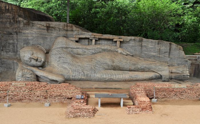 C'est de Polonnaruwa que les souverains dirigèrent le pays entre les 11è et 13è siècle, période certes courte mais prospère grâce à un épanouissement exceptionnel des arts et de l'architectures bouddhiques sous l'influence évidente des cultures d'Inde du Sud. A son apogée, la cité s'étirait sur plusieurs kilomètres sur la façade orientale de l’immense réservoir Parakrama Samudra, et six kilomètres de puissantes enceintes protégeaient monastères, palais et temples bouddhiques et hindous. Il faut remonter à 993 pour voir les armées tamoules des Chola piller Anuradhapura et installer la capitale de l'île à Polonnaruwa jusqu'en 1214. La ville est alors habitée par une population cosmopolite constituée d'Indiens du Sud (hindous) et de Cinghalais (bouddhistes). Mais en 1073, le roi Vijayabahu 1er chasse les Chola hors du Sri-Lanka et conserve Polonnaruwa comme capitale, tout en faisant venir des moines de Birmanie, à qui il confie le soin de former un nouveau clergé dans le but de favoriser la résurgence du bouddhisme dans le pays. La mort de ce premier grand roi sera tragique pour le Sri-Lanka car le pays va connaître une guerre civile sanglante les quarante années qui suivront sa disparition. C'est en 1153 que Parakramabahu 1er s'emparera de la cité avant de prendre plus tard le contrôle de tout le territoire. Notre homme est encore aujourd'hui considéré comme le dernier grand souverain du pays, probablement grâce aux nombreux grands travaux qu'il lancera pour redorer l'image de la capitale. Son successeur (et neveu), Nissanka Malla, marchera dans les pas de son oncle et poursuivra les travaux d’agrandissement et d'embellissement de Polonnaruwa tout en prenant soin de soigner son image personnelle. Vers 1293, des mercenaires venus d'Inde du Sud envahiront à nouveau l'île, et la cité sera alors livrée à la jungle des siècles durant.