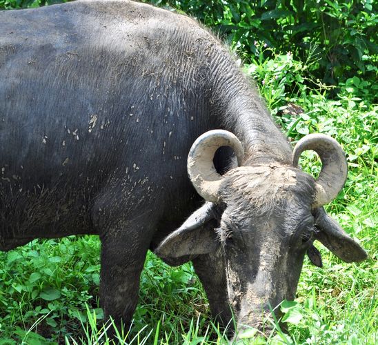 Nous quittons Polonnaruwa vers 7h45 et nous partons en direction d'Aukana, une localité située à environ trente kilomètres de Dambulla, près du lac Kalawera. Un spectacle nouveau s'offre à moi, celui d'une vie rurale sri-lankaise remplie d'activités, du linge qui sèche sur le portail des maisons, des étals de fruits le long de la route et des troupeaux de buffles rencontrés sur notre chemin (ci-dessous). Nous empruntons une route certes goudronnée mais très détériorée sur une bonne partie de notre parcours. Celle-ci longe la digue immense qui, d'un côté retient les eaux du gigantesque lac Kala, et de l'autre débouche sur des paysages de rizières (deuxième photo).