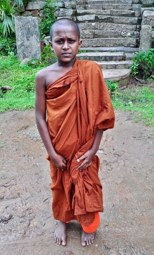 Nous reprenons à présent la route en direction de Reswehera, où se trouve un monastère troglodytique qui fut abandonné dès le début de notre ère. A notre arrivée, nous nous adressons au moine qui détient les clefs de l'endroit, moine qui n'est autre qu'un garçon de ….onze ans (ci-dessous). Nous lui payons le droit d'entrée puis débutons l'ascension d'une longue volée de marches pour atteindre une statue de Bouddha (deuxième photo) elle aussi taillée dans le roc, de la même taille, dans la même posture et presque aussi haute que celle d'Aukana. Selon la légende, celle-ci serait l'oeuvre d'un disciple du maitre qui sculpta l'autre Bouddha. L'élève en question aurait ainsi laissé son œuvre en suspens, conscient qu'il n'atteindrait jamais la perfection. D'autres prétendent que notre homme aurait jeté l'éponge en raison de fissures apparues dans la pierre. La grotte abritant un Bouddha couché, elle, demeurera malheureusement close, mais notre moine nous ouvrira tout de même la porte d'une autre grotte contenant des peintures murales datant de la période kandyenne. L'ensemble de ce monastère est un endroit isolé de tout et rarement visité par les touristes. Il fut édifié successivement par les rois Dewanampiya Tissa, Valagamba et Mahasen. On estime que plus de 360 moines vécurent autrefois à l'intérieur de ce temple, dès le 3è siècle avant JC, et occupèrent l'endroit jusqu'au début de notre ère. Sur place, 99 grottes furent retrouvées, qui servaient de lieu de méditation aux moines, au milieu de la jungle.