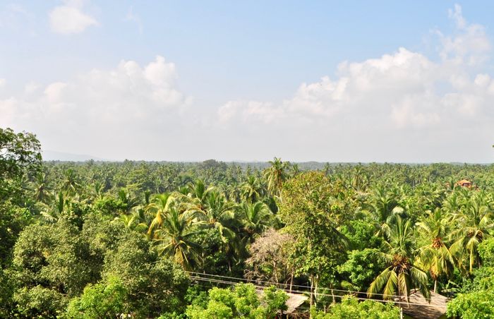 En contrebas du grand lac, s'étirent de grandes étendues de terres, pour la plupart transformées en rizières où hommes et femmes s'activent pour préparer l'ensemencement de la prochaine récolte. De temps à autre, j'observerai aussi une cocoteraie (ci-dessous) dont les fruits sont ici utilisés de diverses manières. Comme dirait Chaminda, le Sri Lanka doit tout au fameux « coco » (il n'y a rien de politique là-dedans!), le fruit d'un palmier dont les Sri-Lankais se servent abondamment comme aliment (huile, lait, poudre de coco râpé, miel, vinaigre, sirop et alcool de coco, caramels...sans parler de l'eau contenue dans le fruit qui contient de nombreux nutriments et constitue une boisson rafraîchissante) et comme produit dérivé entrant dans la composition de balais (fibre de coco), de matelas, de brosses, de tapis et de cordes, autant d'objets fabriqués avec le précieux fruit. Bref, sans coco, point de salut ! Une heure trente après avoir quitté notre hôtel, nous atteignons enfin Aukana (surnommé « Mangeur de soleil ») qui abrite l'une des plus grandes statues de Bouddha au monde. Nous grimpons au sommet d'une petite colline, saluons au passage un groupe d'écoliers à qui je tente d'apprendre quelques mots de français, puis nous arrivons au temple. Après nous être déchaussés, nous ne tardons pas à apercevoir la statue du Bouddha bénissant (deuxième photo), taillée directement dans le roc et haute de 15 mètres. On dit de ce Bouddha qu'il se nourrit du soleil car la statue  est exposée vers l'est, ce qui la rend encore plus visible en matinée. Celle-ci date du 5è siècle et repose sur un socle en forme de lotus. Le Bouddha lève sa lourde main droite en signe de bénédiction tandis que l'autre main effleure son épaule. Sans nul doute, Barana, le légendaire sculpteur de la statue en question était animé d'un souci de perfection lorsqu'il réalisa ce visage serein et presque sévère, et ce magnifique drapé de la robe aux plis si fins. Face à cette statue, se dresse l'arbre de bodhi, puis plus loin, un dagoba.