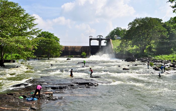 Il a beaucoup plu ces derniers jours et le lac a fait le plein. Construit durant le règne de Dhathusena en 307 avant JC, cette réserve d'eau est en réalité formée d'un double réservoir (les lacs Kala et Balalu) d'une capacité de 123 millions de mètres cubes d'eau. Cette région nord fut occupée par les envahisseurs tamouls entre 429 et 455 avant JC, jusqu'à ce qu'ils se fassent chasser par le roi Dhathusena qui prendra le pouvoir et reconstruira l'ancien système d'irrigation, en érigeant canaux et réservoirs dans les environs d'Anuradhapura. Aujourd'hui, c'est la fête car l'eau, source de vie, est abondante, si abondante que le lac Kala déborde et qu'il a fallu ouvrir les vannes pour libérer du précieux liquide dans la rivière en contrebas (en photo ci-dessous). Et le cours d'eau d'attirer les gens du village venus admirer les pêcheurs occasionnels en train de se livrer à leur activité favorite.
