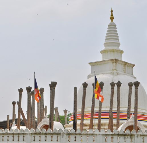 Notre exploration se poursuit par le Thuparama Dagoba (ci-dessous) situé au nord du Ruwanwelisiya. Edifié sous le roi Devanampiya Tissa, après sa conversion par Mahinda, ce dagoba revêt pour les Bouddhistes une importance cruciale car l'édifice, malgré sa taille modeste, aurait hébergé la clavicule droite de Bouddha. La date de sa fondation en ferait l'un des dagobas les plus anciens de l'île mais le dagoba actuel n'est qu'une reconstruction du milieu du 19è siècle qui ne respecte même pas la forme originelle, puisque le monument est en forme de « cloche » et non « de montagne de riz ». Quant aux piliers en pierre qui entourent la construction, ils devaient au départ soutenir une toiture.