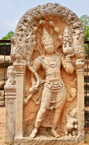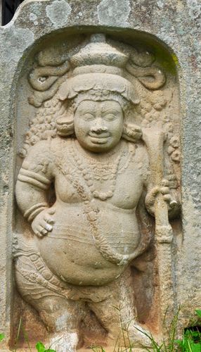 Si le Palais du roi Mahasen a aujourd'hui disparu, il en va de même pour la salle capitulaire du monastère de Ratnaprasada (ci-dessous), ou Palais des pierres précieuses. Tous les sanctuaires et les palais importants étaient veillés par des gardiens en pierre coiffé du nagaraja (ou roi naga) et de la couronne traditionnelle du cobra à sept têtes. Chaque détail de sa tenue, de la ceinture aux glands, apparaît détaillé avec soin et très bien préservé. Son corps se contorsionne pour donner une impression de grâce et de souplesse, avec ses pieds effleurant le sol. La statue offre les symboles de la prospérité et une branche en fleur. Le dessus de sa tête laisse apparaître un arc avec ses quatre makara, des  créatures mythologiques composées de sept animaux différents. Enfin, à ses pieds, se trouve un serviteur nain (gana) qui semble ricaner devant cette scène surréaliste.