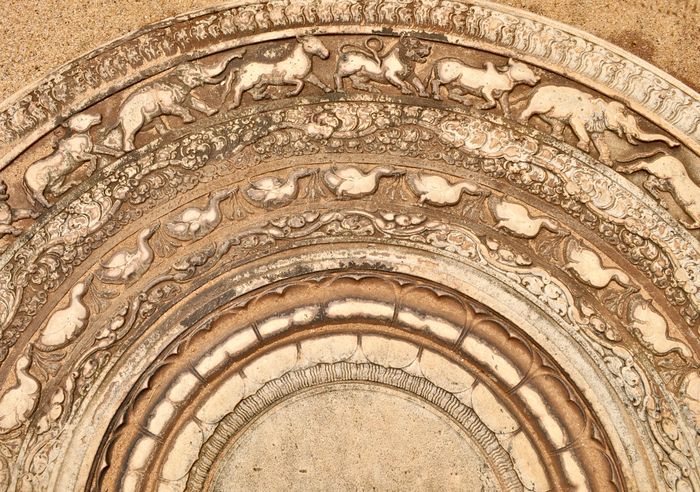 Un joyau de pierre offre toujours ses attraits dans l'ancien Palais du roi Mahasen : ce lieu qui fut aussi désigné sous le nom de Pavillon de la Reine a conservé l'une des plus belles pierres de lune (ci-dessous) d'Anuradhapura, sous la forme d'un superbe seuil de granit  hémicirculaire finement sculpté de motifs symboliques. Elément caractéristique de la sculpture cinghalaise, la pierre de lune (ou sandakata pahana) est une dalle en forme de demi-lune faite de granit poli, qui est installée à l'entrée des sanctuaires importants. Cette pierre joue le rôle de seuil spirituel en offrant une allégorie du passage du monde physique et de ses distractions au nirvana. Les détails sculpturaux varient bien sûr d'une pierre à l'autre mais l'on retrouve certains éléments, voire tous. Dans un cercle extérieur de flammes symbolisant le désir, s'inscrivent l'éléphant qui représente la naissance, le taureau qui symbolise la vieillesse, le lion qui représente la maladie et le cheval la mort. Vient ensuite un registre composé de vigne ou de serpents qui incarnent l'attachement à la vie, et d'oies symbolisant la pureté. Au centre de la pierre se déploie un lotus qui figure la réalisation du nirvana. Les symboles évolueront toutefois selon les époques, comme sous les périodes de Polonnaruwa et de Kandya, avec la disparition progressive du lion et du taureau. De nos jours, la pierre de lune a troqué son symbolisme contre un rôle purement décoratif à motifs floraux.