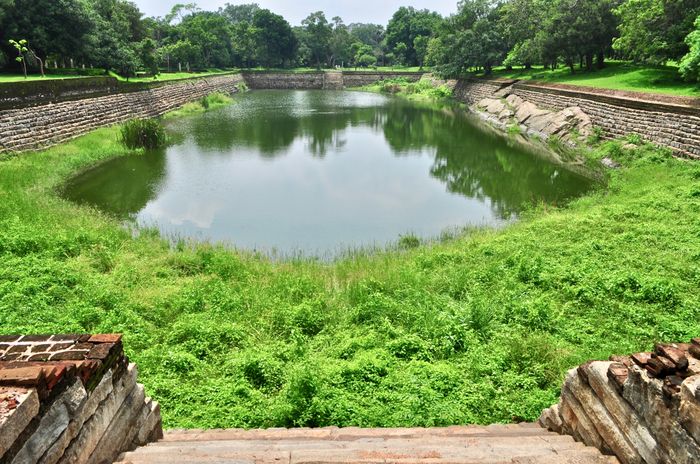 Non loin de là, se trouvent les restes du réfectoire de Mahapali, dont l'auge (visible sur cette deuxième photo ci-dessous) était remplie de riz destiné à nourrir le millier de moines résidant sur place. A côté, une autre auge, bien plus petite, contenait le curry. A une centaine de mètres de là, nous découvrons le plus grand bassin du Sri Lanka (que Chaminda surnomme bassin des éléphants) ayant servi aux ablutions des moines (troisième photo). Celui-ci mesure 159 mètres de long, 52 ,70 mètres de large et 9,5 mètres de profondeur, et est alimenté en eau grâce à des réservoirs proches. Lui-même aurait servi de réserve d'eau pour l'alimentation de bassins et des puits du monastère d'Abhayagiri.