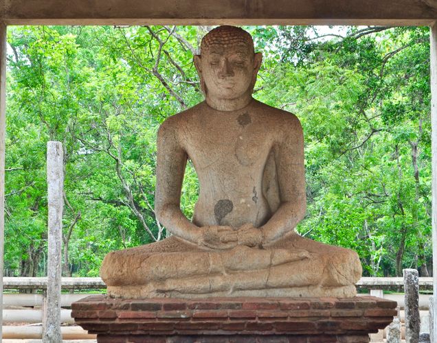 Fondé par le roi Vattagamini en 88 avant JC, le vaste monastère d'Abhayagiri hébergea jusqu'à 5000 moines. Cette puissante institution fut réputée pour son interprétation éclectique et hétérodoxe du bouddhisme, fortement influencée par le courant mahaya déjà implanté au Tibet, en Chine ou au Japon. Ce genre de pratique indisposera d'ailleurs les moines d'autres monastères locaux, adeptes du strict canon theravada, qui verront cette pratique nouvelle de la religion comme blasphématoire. Le célèbre monastère connaitra son apogée sous le règne de Mahasena qui financera l'émergence du palais, de bains et d'une magnifique statuaire. L'entrée sur le site est marquée par une statue de Samadhi Buddha (ci-dessous) en posture de méditation. Les moines du monastère d'Abhayagiri allaient se baigner dans les bassins jumeaux, aussi appelés Kuttam Pokuna (deuxième photo). Des faux jumeaux, car les deux bassins ne sont pas exactement identiques, l'un mesurant  28 mètres de longueur et l'autre, 40 mètres. Les ruines du monastère se répartissent quant à elle autour du gigantesque Abhayagiri Dagoba qui est désormais le troisième plus grand stupa d'Anuradhapura et culmine à 75 mètres de haut. Ce dagoba est toujours en cours de restauration, après avoir été totalement envahi par la végétation (troisième photo). Autre curiosité du site archéologique, située à quelques mètres du musée d'Abhayagiri, le Dalada Maligawa, ou Temple de la Dent, qui reçut le premier la relique de la Dent à son arrivée au Lanka, au 4è siècle. Il n'en reste plus aujourd'hui que des piliers de pierre.