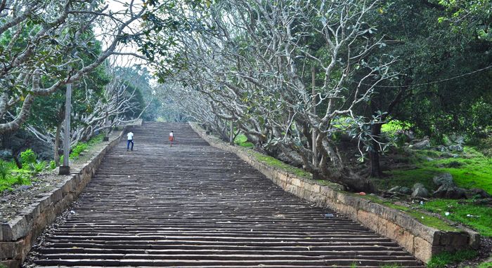 A condition d'avoir de bonnes jambes, Mihintale séduit les visiteurs avec ses sanctuaires, ses dagobas et ses grottes parsemés entre bois et collines (en photo ci-dessus). Ici, plus c'est haut et plus c'est sacré. Comme dans d'autres pays du monde, les sites haut perchés revêtent un caractère particulier et les fidèles gravissent des volées de marches, parfois même à genoux, voire en rampant. Ce ne sera pas notre cas lorsque nous emprunterons notre premier escalier de la journée (ci-dessous) avec ses marches heureusement peu raides et faciles d'accès. L'endroit est certes fort agréable puisque le parcours est bordé de frangipaniers. Nous partons ainsi en direction de la colline sacrée pour nous diriger bientôt sur notre droite et emprunter un haut escalier nettement plus raide, qui nous conduira jusqu'au Kantaka Chetiya (deuxième photo), le plus ancien dagoba de la ville. La construction du premier escalier date du règne de Bhathika Abhaya, bien avant celle de la route qui offre un raccourci jusqu'au premier niveau de la colline. A condition de prendre de profondes inspirations et un pas méditatif, cette promenade est plaisante mais prenez garde de ne pas vous mouiller les pieds en bas des escaliers, ceux-ci étant souvent inondés (marchez sur les petits murets qui les longent).