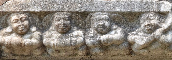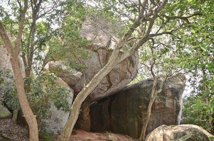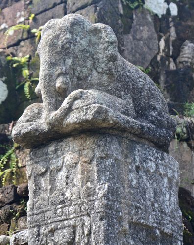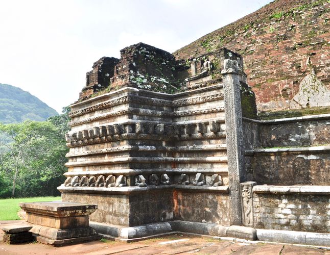 Le Kantaka Chetiya est l'un des premiers monuments religieux de l'île, érigé au 2è siècle avant JC, mais n'a été mis au jour qu'en 1934. L'édifice possède une base de 130 mètres de circonférence qui consiste en trois marches géantes de pierres taillées, une caractéristique des dagobas cinghalais qui signifie le triple joyau bouddhique (le Bouddha, ses enseignements et le sangha). Sur sa partie supérieure, le dôme ne s'élève plus qu'à douze mètres (au lieu de 30 mètres lors de sa construction). J'admire par contre les quatre sanctuaires (vahalkada) richement décorés, qui marquent les quatre points cardinaux : chaque point cardinal dispose ainsi de son animal, l'éléphant (ci-dessous) pour l'Est, le lion pour le nord, le cheval pour l'ouest et le buffle pour le sud. La façade orientale est encore celle qui est la mieux préservée, avec ses frises sculptées d'éléphants et de génies (deuxième photo), offrant sur chaque côté une haute colonne sculptée. L'état de la façade occidentale est plus détérioré, la faute sans doute aux moussons successives. Il me sera impossible d'apprécier ses sculptures (on parle pourtant de colonnes travaillées et ornées d'animaux et de plantes symboliques) au point que je me tournerai rapidement vers un énorme rocher sur lequel je découvrirai une inscription rupestre en brahmi, ancêtre de l'écriture pali, sur ce rocher habité par les moines vers le 3è siècle avant JC. Chaminda me conduit un peu plus loin afin d'apercevoir l'une de ces dizaines de grottes locales (troisième photo).