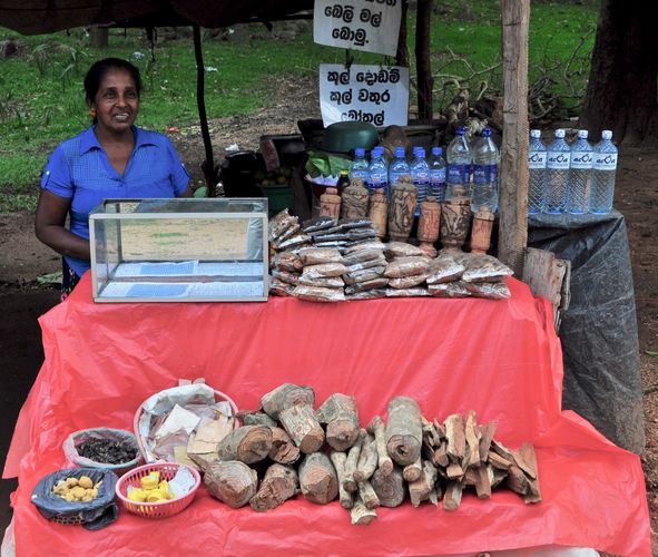 En redescendant de la colline sacrée, Chaminda et moi nous arrêtons devant un étal d'herbes médicinales (deuxième photo). Une pause est la bienvenue après ces ascensions qui m'ont épuisées. Et d'en profiter pour déguster une « beli », tisane ayant pour vertu de combattre les toxines et la gastroentérite. Mieux vaut prévenir que guérir !