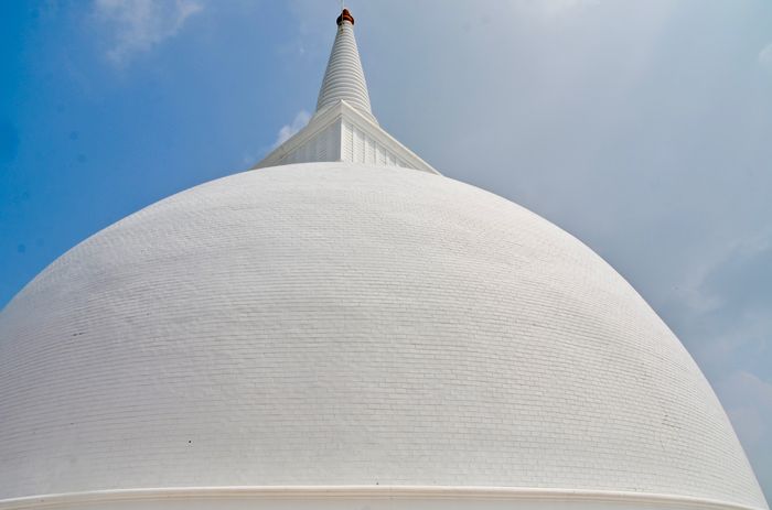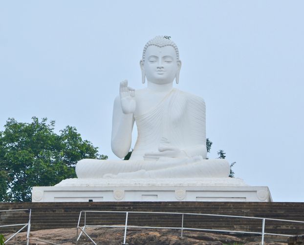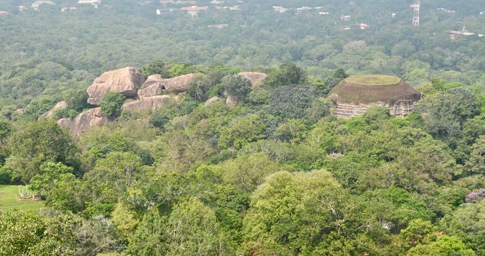 Nous redescendons par l'escalier de la façade sud du dagoba puis atteignons plusieurs vestiges monastiques au bout de quelques minutes, dont ceux de l'ancien réfectoire des moines, Dana Salawa. Le vaste espace rectangulaire de ce réfectoire renferme encore deux longues auges de pierre (« bateau à riz » et « bateau à gruau ») que l'on remplissait de nourriture pour les moines et les pèlerins. A une encablure de là, se dressait la maison des images dont l'entrée est matérialisée par deux grandes dalles de pierre sur lesquelles sont gravées en langue cinghalaise les règles du monastère, de l'heure du lever à la manière de se conduire envers les malades. Le troisième escalier, abrupt et étroit, mène quant à lui jusqu'à la plus haute terrasse. Il nous faudra alors retirer nos chaussures pour continuer notre ascension. En face de nous se dresse le petit Ambasthala dagoba (ou dagoba du manguier) qui matérialise l'emplacement où Mahinda surprit le roi Devanampiya Tissa en pleine chasse. Ce dagoba aurait été érigé sur l'emplacement exact où Mahinda se tenait ce jour-là et une statue du souverain marque aussi sa position. Sur notre gauche, un grand bouddha blanc (en photo ci-dessous) assis sur un rocher domine la situation. Sur la droite, un autre escalier mène au sommet de l'Aradhana Gala, le rocher de la convocation. C'est de ce rocher que Mahinda prêcha son premier sermon. Non loin de là, un énorme rocher est accessible par un petit sentier à travers bois. Celui-ci recouvre le Mihindu Guha (le lit de Mahinda), une dalle de pierre lisse qui servait de lieu de repos à Mahinda.