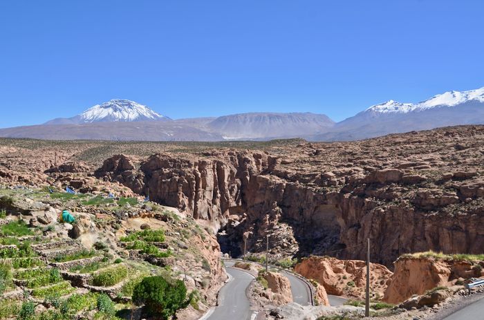 Pour ce genre d'expédition (c'en est une!), je vous conseille d'emmener avec vous de quoi vous couvrir et de quoi vous sustenter car vous ne trouverez aucun commerce dans ce coin isolé du nord chilien : notre prochain étape est Toconce, un minuscule village perché sur une falaise, où abondent les panneaux solaires pour assurer la fourniture électrique continue aux habitants. Nous sommes alors à 3300 mètres d'altitude et à proximité du stratovolcan Toconce d'une part, et de la rivière Toconce d'autre part (dont les eaux se jettent dans la rivière salée) en contrebas. Il suffit de se rendre jusqu'à la petite église de l'endroit pour profiter du paysage environnant (ci-dessous) . Et d'apercevoir en contrebas des cultures en terrasses, l'une des caractéristiques de ce petit village, où nous ne trouverons pas plus ici qu'ailleurs un petit café histoire de faire une pause salvatrice. Autre curiosité : le terrain de football, démesuré par rapport à la taille du village. Rien ici n'attire le touriste si ce n'est un grand panneau de bienvenue souhaitant la bienvenue aux visiteurs.