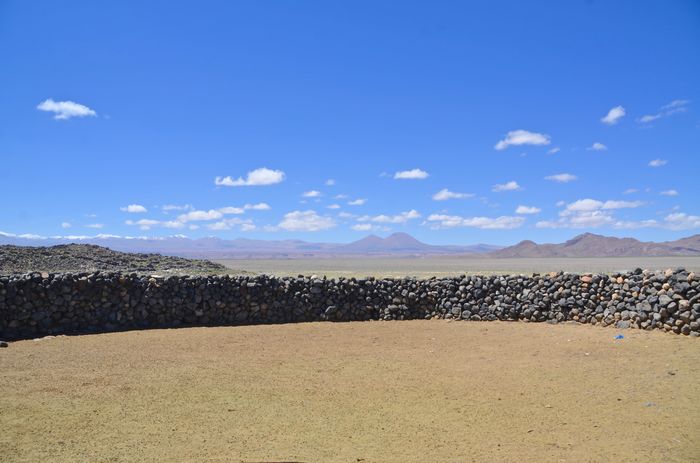 Dernière étape de notre visite : Pucara de Turi. Au bord de la grande plaine fertile, vers le nord-ouest, se trouvent les restes de la pukara (forteresse) de Turi. Celle-ci, érigée sur des contreforts assez bas, n'excède pas 25 mètres. D'une superficie de près de 4 hectares, on trouve ici ce qui fut jadis le plus important village atacamène. L'édification de cette pucara remonterait aux environs de 1250, avant que Tupac Yupanqui, chef Inca ne conquière les Atacamènes au début du 15è siècle. Là se dressèrent des habitations de cinq mètres sur quatre, des silos attenants, des petits patios, des cours intérieures et des enclos communautaires. Ces enclos (ci-dessous), de forme circulaire, et généralement d'un mètre trente de hauteur se dressent par groupes de trois ou quatre. Six de ces « torreones » situés dans une zone plus élevée de la pucara, mesurent même jusqu'à 14 mètres de diamètre. Pour leur construction, les anciens utilisèrent la pierre volcanique, un matériau plus difficile à façonner et à travail mais qui résiste mieux à l'épreuve du temps. La fin du 15è siècle, avec la conquête des Incas, verra l'apparition d'un nouveau matériau de construction, l'adobe, une brique de terre crue comprimée et séchée au soleil qui servira à bâtir quelques maisons à Turi.