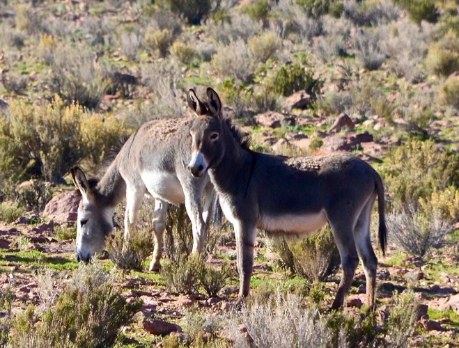 La température, d'abord fraiche en cette matinée s’élèvera au fur et à mesure de notre balade. A mi-chemin, nous croiserons des ânes (ci-dessous) en goguette au milieu de nulle part. Les pauvres bêtes ont l'air surpris de nous voir ici mais retournent très vite à leurs occupations favorites.