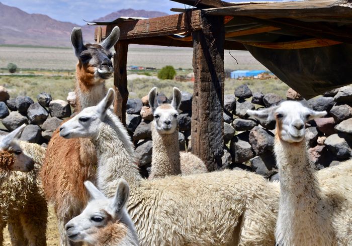 Dans un enclos, nous découvrons un troupeau de lamas (deuxième photo) prenant sagement le soleil. Interloqués, les animaux nous dévisageront silencieusement.