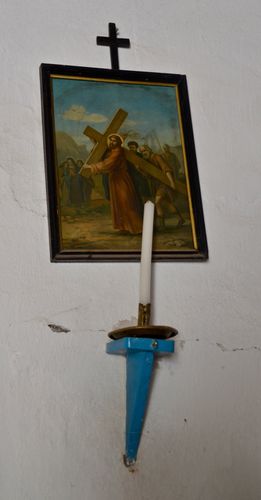 Jean-Sébastien et moi nous garons près de l'église Saint François (ci-dessous), un véritable chef d'oeuvre qui est désormais la plus vieille église chilienne. Bâti en 1540 par les Indigènes avec des pierres récupérées d'une forteresse, cet édifice, devenu depuis monument national, est fait d'adobe, un mélange d'argile et de paille finement hachée, le tout mélangé à de l'eau. L'ensemble offre des murs épais (1m20) tandis que le toit, lui, est composé de bois de cactus, tout comme d'ailleurs le superbe portail de l'entrée, réalisé à l'aide de planches de bois de cactus reliées entre elles par des lanières de cuir. L'intérieur de l'église abrite divers objets dont des scènes du chemin de croix agrémentées de bougies (troisième photo). Autres curiosités : un tableau représentant la Passion du Christ et une croix avec bras repliables pour un meilleur transport. On célèbre ici Saint François d'Assise chaque 4 octobre à travers une fête paroissiale d'envergure.