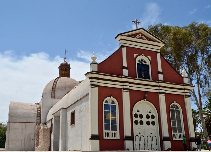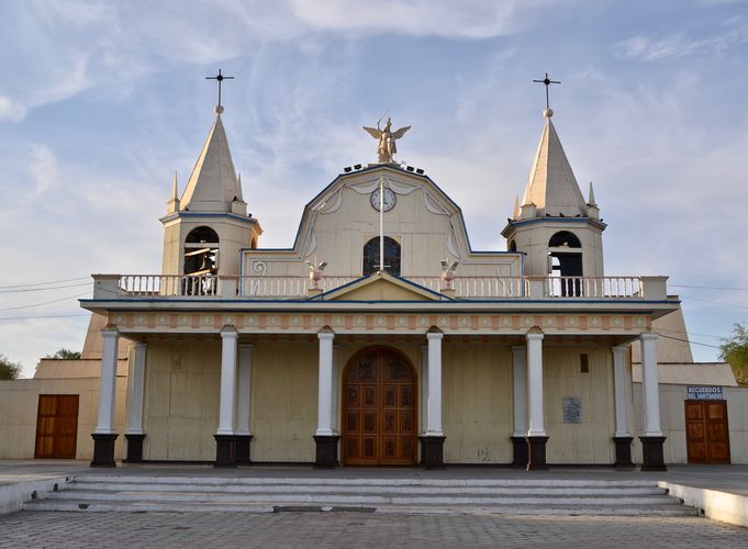 La Tirana est un village de 800 âmes situé dans un oasis au cœur de la Pampa de Tamarugal (nom faisant référence au bois tamarugo, abondant à cet endroit). L'église du village (en photo ci-dessous) est d'ailleurs en bois rempli de calamine. Elle est l'oeuvre du Père Friedrich et fut érigée au début du 20è siècle, quelques années seulement après les tremblements de terre de 1866 et 1877 qui détruisirent le précédent édifice religieux, probablement du au Père Rendon. L'originalité de Tirana est qu'il constitue le principal sanctuaire religieux du Norte Grande chilien. En effet, la Fiesta de Tirana,fête annuelle commémorant la Vierge du Carmen tous les ans pendant une semaine, dont le point d'apogée est le 16 juillet, attire plus de 250000 personnes. Le pape François reconnut officiellement cette célébration lors de sa visite apostolique ici en janvier 2018. Cette célébration tire d'ailleurs son origine d'une autre fête brésilienne, la Pachamama, en l'honneur de la Vierge de Copacabana, qui naquit de la volonté des mineurs aymaras, des Boliviens qui travaillaient jadis dans les gisements de cuivre et d'argent. Et la célèbre fête de Tirana de faire donc date, chaque 16 juillet, depuis le boum de l'exploitation du salpêtre au 19è siècle, en ayant simplement changé de date de célébration au moment de la Guerre du Pacifique, selon les pays (le 16 juillet pour les Chiliens, le 28 juillet au Pérou et le 6 août en Bolivie).