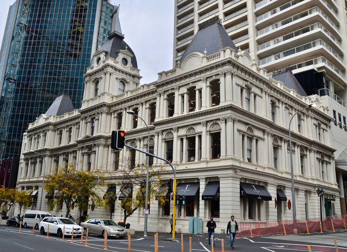 Je parcours les quais du port et me retrouve bientôt entouré de yachts et de navires de luxe laissant apparaître la Sky Tower en arrière-plan. Il y a foule en ce jour férié mais la promenade reste malgré tout agréable, bien que n'offrant que boutiques chics, bars, bons restaurants et des constructions modernes et luxueuses dont je ne préfère pas connaître le prix. A quelques minutes du Ferry Building se dresse toujours l'ancienne douane (ci-dessous) qui fut érigée en 1889 sur Customs Street. Un peu plus loin et dans cette même rue se trouve Tepid Baths (Bains Tepid), un établissement de bains construit en 1914 qui possède encore aujourd'hui des équipements sportifs de pointe. On y trouve des piscines intérieures historiques qui connurent, dès leur ouverture, un vif succès auprès du public.