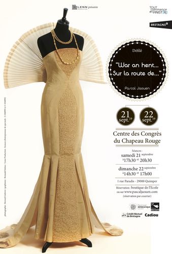 Cette année, Quimper a décidé de rendre hommage au « brodeur » de son vivant en proposant au public un ensemble d'expositions qui retrace le parcours professionnel de Pascal Jaouen. Jusqu'au 22 septembre prochain, les musées de Quimper, la cathédrale Saint-Corentin, la médiathèque, la maison du Patrimoine et la galerie de l'Ecole de broderie d'Art accueillent une rétrospective des différentes collections citées plus haut sous forme de photos, d'ateliers, d'expositions, de conférences et de surprises : des déambulations sont ainsi prévues les 25 juillet, 8 août et 5 septembre, à 11h30, lors d'une visite commentée par Pascal Jaouen en personne, depuis l'Ecole de Broderie d'Art jusqu'au Musée départemental breton. Le point d'orgue de cet événement restera toutefois la présentation de la dernière collection de Pascal Jaouen lors du défilé des 21 et 22 septembre prochain à Quimper. »War en Hent-Sur la route de... » rassemblera ainsi une trentaine de tenues sous le signe du luxe et de l'art de la broderie haute couture comme peu de brodeurs savent encore la mettre en œuvre. Parmi ces modèles, on note une robe oiseau écrue (robe courte de satin blanc à picots carrés, ayant demandé 350 heures d'ouvrage à la brodeuse Marie-Dominique Jollet) et la robe oiseau bleue (247 heures de travail, 11200 perles et 96 mètres de soie perlée...). Le défilé sera accompagné d'une musique originale de Cécile Corbel (harpiste, chanteuse, compositrice de chansons et grande artiste celte) et de  Simon Caby, tandis que quatre danseurs habillés spécialement par le créateur, accompagneront les mannequins. Mis en scène par Mick Nedelec, ce défilé-spectacle promet d'être encore un joli succès. Et un bien bel hommage largement mérité à Pascal Jaouen, l'enfant du pays qui fit temps pour l'art de la broderie traditionnelle, de fil en aiguille...