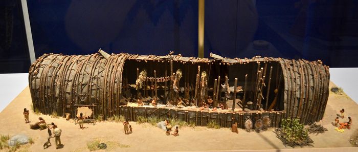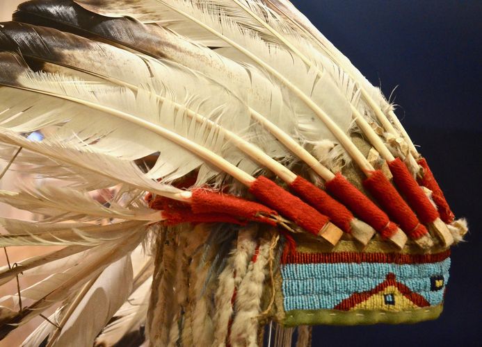 Le reste de la section s'articule autour de l'expression et du maintien de ces grandes croyances et des coutumes haudenousaunees et anishinabes à travers la tradition orale, les systèmes d'organisation sociale et politique, la musique et les spectacles, l'activité politique et la transmission des motifs de génération en génération. J'admirerai sur place plusieurs objets dont une maquette représentant une maison longue iroquoienne (en photo ci-dessous). Cette habitation traditionnelle est en temps normal large de sept mètress et longue de 14 à ...100 mètres. Elle peut ainsi loger plusieurs familles apparentées. Après son mariage, l'homme habite dans la maison longue de la famille de sa femme, tandis que les rencontres politiques et les cérémonies importantes, elles, se déroulent dans la plus grande maison du village, plus probablement celle du chef. Plus loin, une robe à clochettes ayant appartenu à plusieurs communautés anishinabes en 1900 est toujours associée à un pouvoir de guérison. Un panier en écorce de bouleau et un porte-bébé à motif perlé datant du 20è siècle permet quant à lui d'apprécier la transmission d'un motif floral d'une génération à une autre au sein d'une famille anishinabe. La crise d'Oka (de 1990) se rappelle à nous avec une sculpture en stéatite, un drapeau du guerrier mohawk et un chandail commémorant le blocage du pont Mercier. Autant de symboles témoignant de la volonté des Premières Nations de préserver leurs cultures et leur identité. Dans une autre vitrine, je m'arrête devant la coiffure de guerre de Sitting Bull (deuxième photo), un cadeau fait au musée en 1915 par Sir William Van Horne, alors président du Canadien Pacifique. Notre homme avait reçu ce cadeau du major James Walsh de la Police à cheval du Nord-Ouest, qui l'aurait reçu de Sitting Bull en personne. Cette coiffure incarne des pouvoirs sacrés tout en représentant les pouvoirs guerriers de celui qui la porte. Les plumes évoquent l'aigle portant les prières au Créateur et leur disposition évoque directement le soleil.