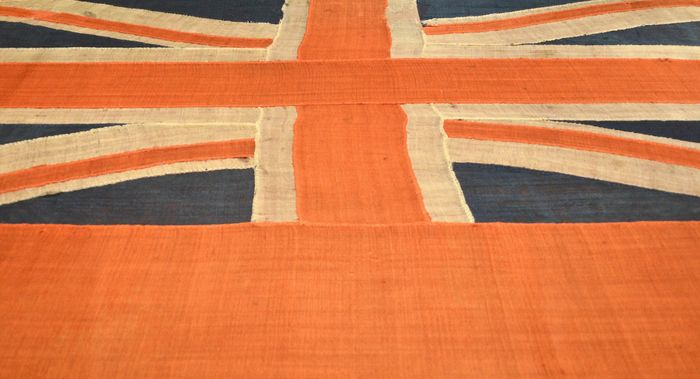 Je ne trouverai pas la première partie de l'exposition portant sur les Alliés souverains et s'intéressant aux Premières Nations qui s'allièrent à la Couronne britannique pour contrer l'expansion territoriale des Américains. Heureusement, ma recherche documentaire personnelle sera fructueuse et m'enseignera bien des choses sur ce thème. Ces Premières Nations entretenaient depuis longtemps des relations diplomatiques avec les Britanniques lors de rencontres régulières durant lesquelles avaient lieu un échange de présents. Les Britanniques offraient souvent des parures en argent ou des tissus, cadeaux que l'on peut voir sur place et qui furent portés par les membres des Premières Nations au tournant du 19è siècle. Des vitrines présentent les vêtements et les armes traditionnelles de plusieurs chefs indiens dont John Norton, et bien sûr Tecumseh. Un cadeau diplomatique, le « Red Ensign », compte cependant parmi les pièces maitresses de cette partie de la galerie consacrée aux Autochtones (ci-dessous). Offert au chef anishinabe Oshawana durant la guerre de 1812, le Red Ensign que je vois devant moi n'est pas le cadeau original des Britanniques mais une copie. Le vrai drapeau, lui, a été mis à l'abri afin d'en préserver les couleurs. Une vidéo est mise à la disposition du public et retrace les travaux de conservation de ce drapeau historique. Un peu plus loin, le visiteur découvre un récit très vivant chez les Six Nations, de la vie au village mohawk à la suite de la disparition de nombreux guerriers au lendemain de la guerre de 1812.