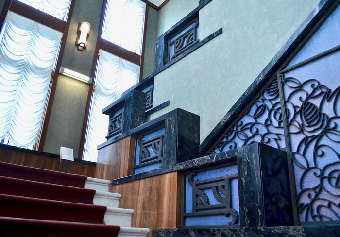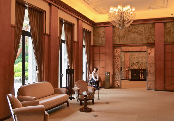 La chose la plus marquante en franchissant le hall d'entrée principal est l'existence de portes aux bas-reliefs de verre et de leurs déesses ailées, œuvres de l'artiste verrier français René Lalique. Les quatre silhouettes des déesses ressortent des panneaux, et donnent ainsi l'impression aux invités de leur souhaiter la bienvenue.La mosaïque du sol est en pierre naturelle et fut réalisée d'après un modèle dessiné par Takashi Oga.