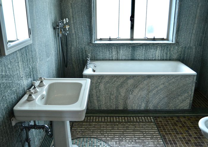 Une salle de bains principale (deuxième photo ci-dessus) fut bien sûr construite à l'usage exclusif du Prince et de la Princesse et se trouve à côté de la chambre du Prince car ce dernier avait des difficultés pour marcher depuis son accident de la circulation. Le sol présente un motif de mosaïque constitué de carreaux de céramique japonaise, tandis que les murs sont habillés de marbre importé. Deux autres salles de bains sont disponibles dans cette bâtisse, une pour le jeune prince et l'autre pour la jeune princesse.