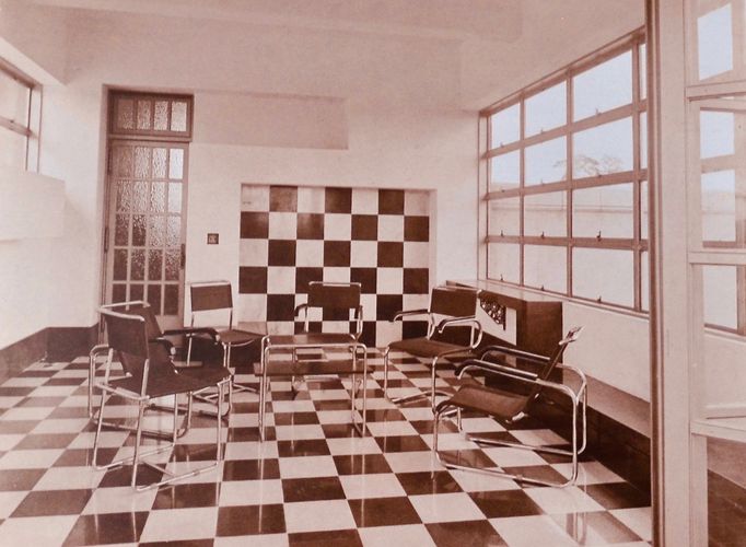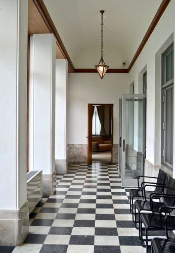 La salle d'attente officielle, uniquement accessible par le hall d'entrée fut celle où serviteurs et chauffeurs des visiteurs attendaient leurs maitres. Colonnes, portes et rebonds des fenêtres sont en bois d'érable, un bois difficile à travailler mais dont la surface offre un rendu brillant comme de la soie. Les motifs du parquet sont en damier et le papier peint, reproduction du revêtement d'origine, fut fabriqué par la manufacture suisse Salubra.