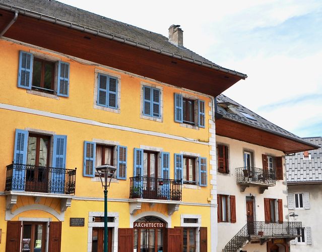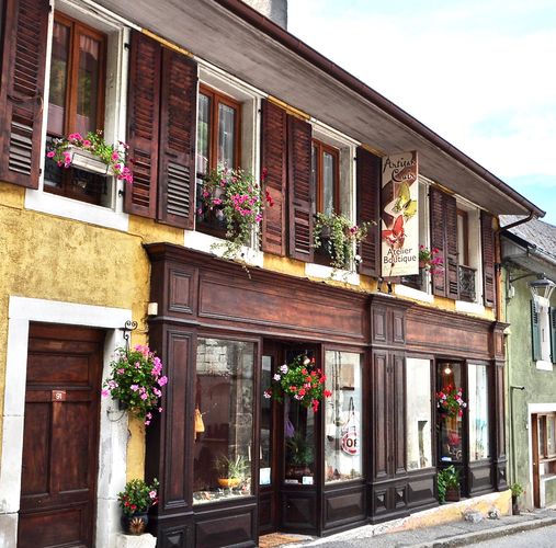 A présent, direction Le Chatelard, capitale historique des Bauges. A ce titre, le bourg est le siège de la communauté de communes du Coeur des Bauges et du Parc naturel régional du massif des Bauges. Une promenade s'impose après avoir facilement garé mon véhicule sur l'un des nombreux parkings proposés aux visiteurs. J'y découvrirai de vieilles maisons (première photo ci-dessous) en enfilade accrochées aux derniers contreforts du Mont Julioz ainsi que le clocher se dressant dans l'échancrure séparant les « Bauges-Devant » et les « Bauges-Derrière ». Les Castelllardinois (c'est ainsi que l'on surnomme les habitants) vivent ainsi dans ce qui fut dès le Moyen-Âge une châtellenie. Amédée V, comte de Savoie, avait  alors octroyé des franchises au bourg dès 1301, franchises renouvelées en 1324 par son fils Edouard de Savoie, puis confirmées en 1392 par Bonne de Bourbon. Le commerce se développera largement d'où ces nombreuses anciennes boutiques (deuxième photo) qui font le charme de l'endroit.