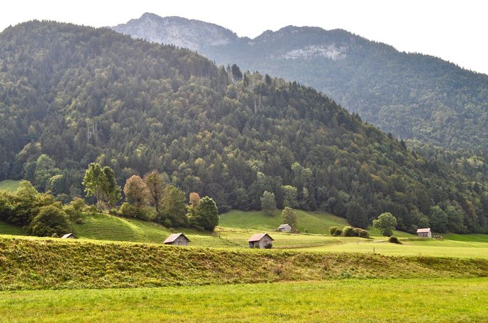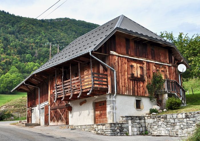 L'habitat est souvent révélateur d'un contexte géographique et d'un mode de vie. L'homme dispose ici de calcaire abondant, roche principale du massif des Bauges et matériau principal de construction. Utilisé comme moellon, pierre de taille ou réduit en chaux, il est employé  pour bâtir églises, châteaux ou simples maisons paysannes. Cependant, il n'existe pas un seul type de calcaire, mais plusieurs, dont certains, plus remarquables (Pierre de Curienne, ou pierre veinée de Doussard) sont utilisés pour réaliser les plus beaux ouvrages (autels, piédestaux ou encadrements...). De même, il n'existe pas dans le massif qu'un seul type de roche (calcaire) mais aussi du schiste noir (mortine) avec lequel on construira des maisons sur les versant Est de la Dent de Cons. En revanche, là où les affleurements rocheux se font plus rares, on se contentera de construire des maisons en terre (pisé, bauge..) comme à l'ouest du massif, sur les collines de l'Albanais. La molasse, elle, servira à l'érection d'habitations là où elle abonde, notamment pour la fabrication des cheminées et des fours grâce à ses propriétés réfractaires. Les toitures étaient en chaume, parfois en tuiles de bois (tavaillons) dans certains alpages, ou en ardoises (pour les demeures bourgeoises). A La Compôte, habité par les Compôtains, certaines demeures du haut du bourg comportent encore des tavalans (ci-dessous), des troncs d'arbres courbés par la neige pour créer des suspentes sous les débords de toit, même si l'utilisation du bois restait marginale dans la construction, si ce n'est pour les bardages fermant les granges et les fenils. Autre spécificité de ce village de moyenne montagne, les grangettes (deuxième photo) jalonnant les prés en face du bourg et utilisées pour entreposer le foin. Znfin, à trois kilomètres de là, se trouve Ecole, un village qui offre sa Maison Faune Flore (voir infos pratiques) en période estivale, avec six films documentaires,une soixantaine de manipulations interactives et maquettes de l'exposition permanente...