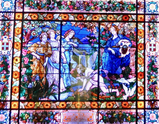 Quelques rues en contrebas, je découvre bientôt le monuments aux morts (ci-dessous), œuvre d'Alfred Boucher inaugurée le 16 juillet 1922 et qui porte le nom de « Monument à la Victoire ». Les noms de 334 Aixois tués en 1914-18 y figurent sur une plaque qui mentionne également les disparus des guerres suivantes. Il ne me faudra qu'une dizaine de minutes pour atteindre le Casino Grand Cercle en passant par la rue de Genève. Les travaux de ce casino avaient débuté dès 1847, sur des plans de l'architecte Pellegrini, qui réalisera quelques années plus tard le Grand Hôtel voisin. Il était en effet impensable que la cité aixoise ne disposât pas de son casino en tant que ville phare de la Belle époque, haut lieu de villégiature, riche en activités et en festivités pour les familles princières, aristocrates et mondains européens. Nombreux étaient alors les palaces en ville, des établissements aujourd'hui devenus de simples copropriétés. La reine Victoria en personne descendra au Café des Bains et au Grand Cercle, tout comme Albert 1er le roi des Belges et l'Aga Khan. Le Casino Grand Cercle est pour sa part entièrement classé à l'inventaire des Monuments historiques. L'endroit, somptueusement orné, ne désemplira pas après son inauguration en 1849 par le roi Victor Emmanuel II de Savoie. Plus petit à l'origine, l'édifice sera agrandi en 1880 puis on y rajoutera un théâtre en 1899. Au plafond de l'actuelle salle de jeu, apparaissent les splendides mosaïques de l'artiste Antonio Salviati. Le foyer du théâtre, lui, offre ses mosaïques en coupole moins chargées d'or et dont le thème est l'eau avec cascades, femmes et nénuphars. Installé dans le bas, un vitrail intitulé « L'amour puise des forces aux sources bienfaisantes d'Aix-les-Bains » diffuse sa luminosité. On relève ici la présence de l'Art nouveau avec l'opulence de la nature et les robes damassées des femmes. La cité est représentée par une femme vêtue de bleu qui s'appuie sur ses armoiries, tandis que trois grâces inspirées par Botticelli se tiennent devant le lac du Bourget et la Dent du Chat pendant que l'amour s'abreuve au courant de la vie. Cette œuvre du maitre-verrier parisien Jacques Galland fut inaugurée en 1897.