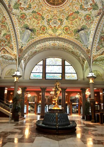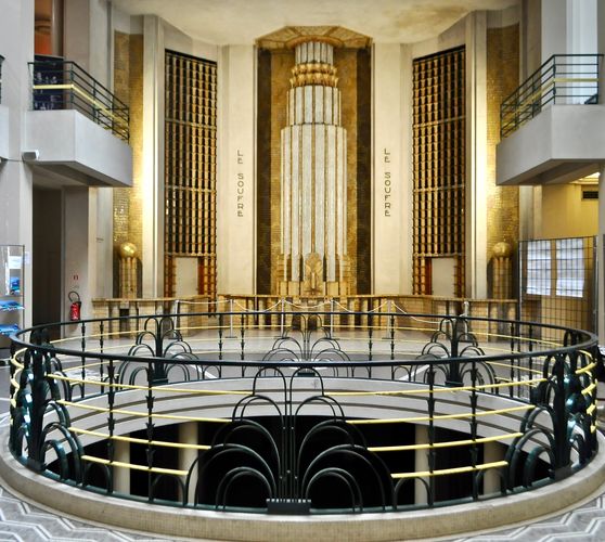Les anciens thermes (ci-dessous) accueillent désormais l'office du tourisme de la ville. C'est là que débute ma visite, à l'intérieur du hall d'un bâtiment qui connaitra plusieurs phases de développement face à l'accroissement du nombre des curistes et à l'évolution des techniques de soins : le bâtiment royal des bains en 1783, les Thermes Pelligrini en 1862 et les Thermes Pétriaux en 1934. De l'extérieur, l'immensité de l'ensemble, qui s'étend sur sept  hectares impressionne, même s'il n'est désormais possible de ne visiter que le grand hall qui raconte l'histoire des eaux thermales dans un style art-déco. Une fontaine pétrifiée appelée « Le Soufre » en grès flammé et mosaïque s'élève sur la droite en entrant. Elle est entourée de deux mappemondes en mosaïque dorée qui symbolisent les mers et les océans. Quant aux garde-corps en fer forgé, ils esquissent les jets d'eau, comme les vitres gravées.