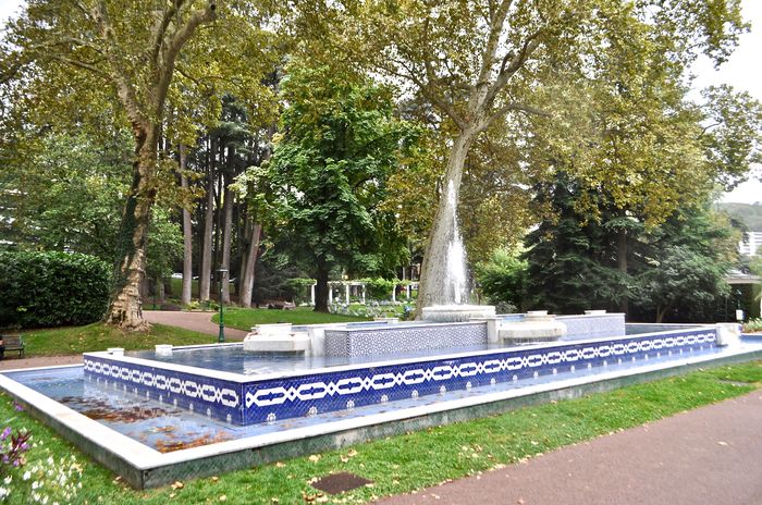 Alors que les premières gouttes de pluie se mettent à tomber, je termine cette visite par le parc thermal qui était jadis le jardin privé du Château du marquis d'Aix. Comme nous l'avons vu plus haut, l'Etat rachètera la propriété du marquis en 1866 et entamera deux ans plus tard les premiers travaux du parc. L'année 1933 apportera son lot de réaménagements avec le concours de Charles Bouhana (pour la partie végétale) et Roger Pétriaux (pour la partie architecturale). Le tout dans le style Art-déco. Dernière grande modification : le remplacement du bassin central d'origine datant des années 1930 par une fontaine marocaine (ci-dessous) dédiée à feu Mohamed V et installée en 2005 à l'occasion du 50è anniversaire des entretiens pour l'indépendance du Maroc qui eurent lieu à Aix en 1955.