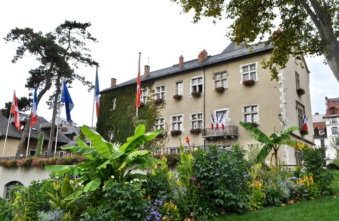 Je traverse la chaussée et me retrouve Place Maurice Mollard, avec en face de moi l'Hôtel de Ville (en photo ci-dessous). L'administration a trouvé refuge dans cet édifice qui fut jadis le château des marquis d'Aix, construit sur  l'emplacement d'un premier ensemble fortifié remontant sans doute à la fin du 12è, début 13è siècle. La reconstruction du château actuel fut entreprise au début du 15è siècle par la famille de Seyssel, alors très proche de la famille de Savoie, en intégrant le Temple de Diane (dont on peut apercevoir un mur depuis le bureau d'accueil de l'hôtel de ville, puis, à l'extérieur, le mur arrière à l'ouest et le mur latéral au nord). Edifice romain, ce temple, datant du 2è siècle, constitue un des éléments qui font d'Aix-les-Bains la ville au passé antique la mieux dotée des alentours, et abrite désormais une collection archéologie qui est accessible lors de visites guidées de la Ville d'Art et d'Histoire. Quant à l'escalier d'honneur de l'ancien château, il fut réalisé dans un style gothique flamboyant après 1571 et à la demande d'Isabeau de la Roche-Andry, française et épouse de François de Seyssel. La municipalité acquerra l'édifice en 1866 pour y installer l'Hôtel de Ville.
