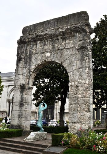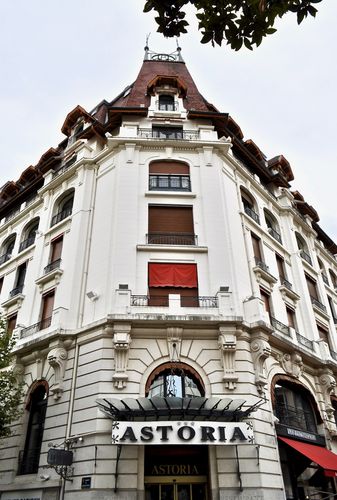 En face de l'arc, se dresse toujours l'Hôtel Astoria (deuxième photo) érigé en 1904-1905 en remplacement de l'hôtel de...l'arc romain ! Profitant du réaménagement de la place, et après démolition de l'ancienne église Notre-Dame, Mr Petit, le propriétaire du premier hôtel, décidera d'en ériger un second, plus prestigieux, avec le concours des architectes suisses les Frères Morsier et Weibel.
