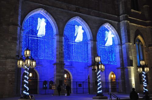 Le Vieux Montréal offre de superbes vues. Il y a d'abord la Basilique Notre Dame, place d' Armes. Toute illuminée la nuit tombée avec ses anges blancs qui jouent de la trompette.
