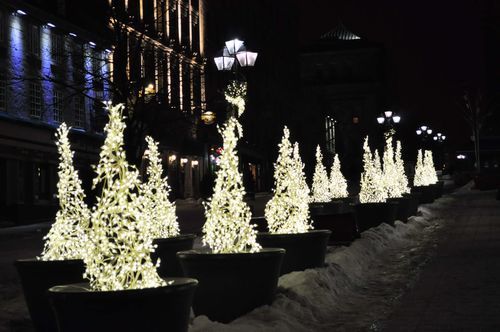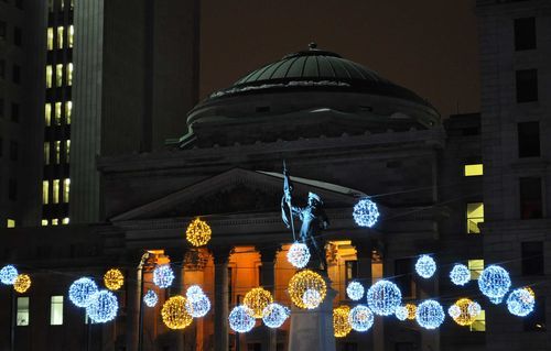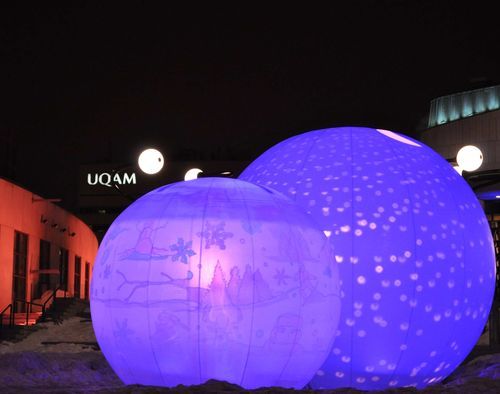 Me voilà presque au terme de ma balade nocturne. Et pas très loin de la Place des Arts, le plus vaste complexe culturel et artistique du Québec et du Canada. La place des Arts compte cinq salles ( offrant un total de 6000 sièges) mais aussi le Théâtre de Maisonneuve. On y trouve également foyers, ateliers, salles de répétition, espaces administratifs et commerciaux et boutiques. C'est sous l'impulsion du maire Jean Drapeau, en 1955, que furent jetées les bases de l'organisme Centre Sir George Etienne Cartier qui devra à terme donner naissance à la Place des Arts. Ce soir, de grosses boules de neiges illuminées tournant sur elles-mêmes ont atterri sur les lieux et donnent un aspect féérique à l'endroit.