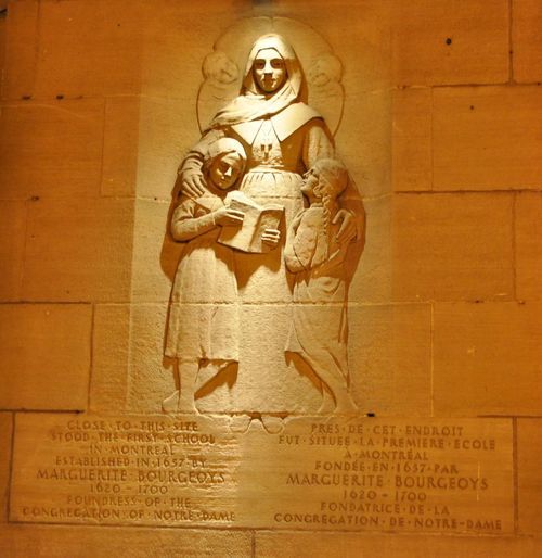 Je descends maintenant vers le port. Sur mon chemin, au niveau de la rue Le Royer, je tombe en arrêt sur une sculpture de pierre: Celle de Marguerite Bourgeois, née à Troyes en 1620, et fondatrice de la Congrégation de Notre-Dame de Montréal. Appartenant à la Congrégation de Notre Dame de Troyes, communauté d'enseignantes cloitrées , Marguerite Bourgeois rencontre le Sieur de Maisonneuve en 1640. Celui-ci est le gouverneur de Montréal et recherche des gens pour développer la sa colonie du Nouveau Monde. Marguerite accepte le défi d'enseigner à Ville Marie ( l'actuelle Montréal) ville alors entièrement dédiée à la Vierge. Elle ouvre ainsi sa première école en 1657, rue Saint Paul (photo ci-dessous).