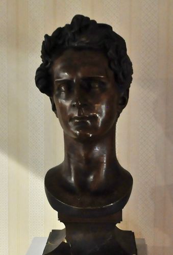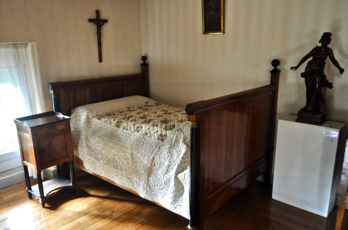 La reconstitution de la chambre que Lamartine occupa durant ses séjours aixois entre 1816 et 1830 n'est qu'une simple suggestion. Certes, les meubles proviennent bien de la Pension Perrier qui se trouvait jadis face à la Mairie et qui fut détruite vers 1930 lors de la construction des Thermes. Le lit du poète (ci-dessous) et une bonne partie des meubles sont de style Empire savoyard. Tous les objets et documents sous vitrine évoquent bien sûr le souvenir d'Alphonse de Lamartine et furent rassemblés à force d'achats, de dons et autres apports divers. Dans un coin de la pièce, sont suspendus deux petites gravures représentant Lamartine et Julie Charles. Le poète, très présent dans cette salle, trouve sa plus fidèle représentation à travers le buste façonné par David d'Angers (ci-dessus). Un peu plus loin, est exposée une statuette en terre cuite représentant le poète, une œuvre du sculpteur Emile Boisseau, qui servit de modèle au grand bronze inauguré en décembre 1990 dans le parc des thermes, à l'occasion du bicentenaire de la naissance du poète.