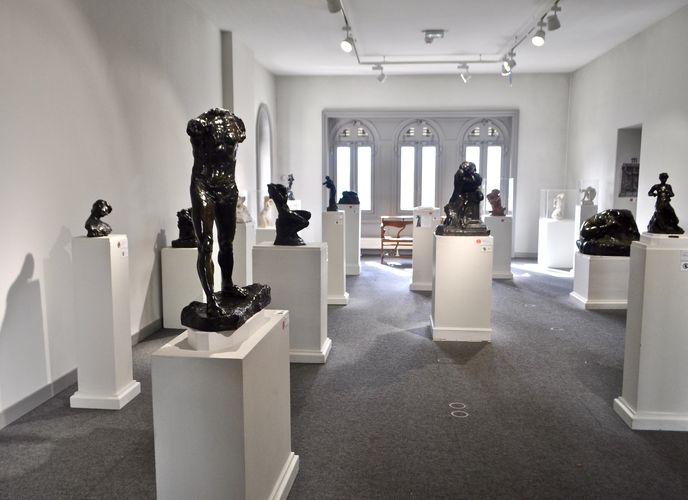 Accompagné d'Amélie Pilon, guide-conférencière, je me rends maintenant au deuxième étage du musée Faure où nous attend la salle Auguste Rodin, et ses 34 sculptures : les bustes de Danielli, Carrier-Belleuse et Manon Lescaut marqueront les débuts du sculpteur, grâce à une technique proche de l'Impressionnisme. L'artiste réalisera trois portraits de femme en bronze (« Pallas au casque », « Mme Fenaille » et « Hanako ») entre 1896 et 1907, puis concevra « La Porte de l'Enfer » (de 1880 à 1917) qui inspirera plusieurs autres sculptures. En 1895, Rodin réutilisera cette figure pour une nouvelle composition, « les Illusions reçues par la Terre ». Aimant par dessus tout les personnages mythologiques, le Docteur Faure fera l'acquisition de « Sirène Toilette de Vénus » et de « Sirène Méditation ». De la même manière, les symboles de douleur, de désespoir et d'accablement font aussi partie de l'univers du sculpteur. On lit alors le désespoir à travers la posture des sujets et non sur leurs visages. Rodin réalisera également des couples représentant l'amour, comme « Roméo et Juliette », ou « Frère et Soeur ».