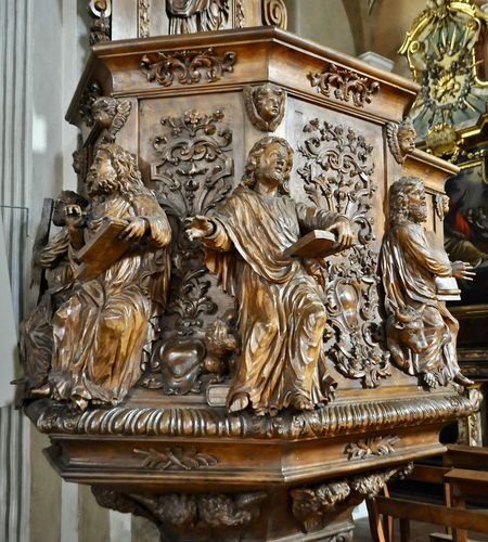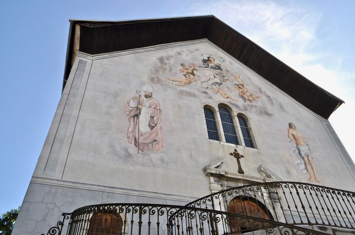Je remonte la Grande Rue jusqu'à tomber sur la fontaine Anselme (ci-dessous) datant de 1711. En ce samedi matin ensoleillé, un calme impressionnant règne dans la petite ville et je peux faire ma séance photos sans contrainte. Bientôt, sur ma gauche, s'élève l'Eglise Saint-Grat (saint patron de la ville d'Aoste et de la vallée du même nom), à laquelle les Savoyards étaient très attachés. On priait alors quotidiennement ce saint pour lui demander de chasser insectes et animaux nuisibles des cultures (tout particulièrement les hannetons, les sauterelles et les rats). L'église, qui date du 18è siècle, est de style baroque et néo-classique et offre une nef, un choeur et un retable remarquables. La chaire (deuxième photo) retient aussi mon attention avec ses quatre évangélistes sculptés. La paroisse de l'ancien bourg, qui remonte au 5è siècle, se trouve à l'ancienne frontière entre la France et l'Italie, sur la voie romaine Alpis Graia. On mentionne cette paroisse pour la première fois en 1014, lorsque le roi de Bourgogne Rodolphe III offre à son épouse Ermengarde plusieurs églises du comté de Savoie dont celle de Conflans. Cette dernière sera ravagée par un incendie en 1632, puis reconstruite et agrandie, consacrée en 1716 et dédiée à l'Assomption de Marie et à Saint-Grat, protecteur des récoltes agricoles.