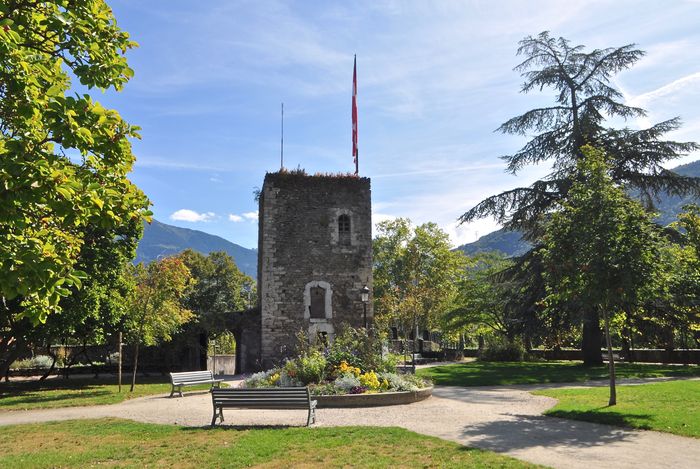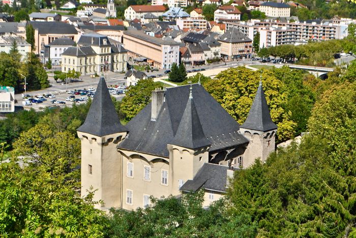 Une petite rue donnant sur la Grande Place m'invite à me rendre au Jardin de la Tour sarrasine (ci-dessous). Après avoir franchi un porche, puis un magnifique escalier en pierre, je découvre ce jardin agrémenté d'un donjon carré, celui de l'ancien château de Conflans qui fut détruit au 18è siècle. De ce jardin-promontoire, la vue sur Albertville, sur la vallée de la Tarentaise puis sur la montagne en arrière-plan est imprenable (deuxième photo). Quant à la tour sarrasine, qui abrite à ses pieds un portail datant du 16è siècle, elle se trouve à la jonction de l'ancien château et de la Grande Roche.