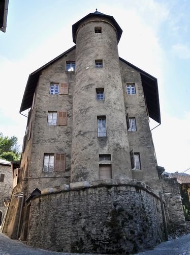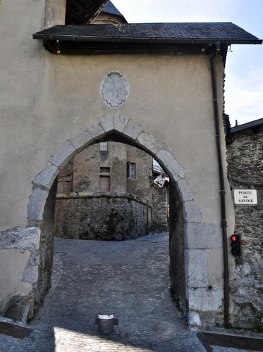 Il y a deux moyens de pénétrer dans le village fortifié : la Porte de Savoie (que j'utiliserai cette fois, et en photo ci-dessous) et la Porte taurine (qui permettait de rejoindre directement la vallée de la Tarentaise). A noter que les deux portes communiquent judicieusement avec la Grande rue. La Porte de Savoie, qui s'appela également « Porte de France », donne sur la Combe de Savoie, et don sur le territoire de l'ancien comté de Savoie. Il ne s'agit pas d'une porte monumentale mais d'un accès aux dimensions plus modestes qui débouche directement sur la tour Ramus (deuxième photo ci-dessous), une maison à tourelles qui servait de logis seigneurial à la famille Ramus.