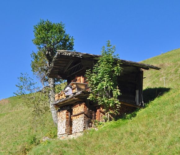 Après m'être arrêté quelques minutes dans la petite église dédiée à Saint Jean-Baptiste, je reprends mon véhicule et poursuis ma route en direction de Boudin, minuscule village, et hameau le plus élevé de la commune de Beaufort. Classé site protégé par les Beaux-Arts depuis...1943, certains de ses chalets figurent aussi à l'inventaire du patrimoine. Installé sur une pente à forte déclivité, ces chalets sont regroupés et étagés en espaliers horizontaux pour profiter à la fois du soleil et d'une belle vue sur la vallée (deuxième photo). Je ne la verrai pas cette fois mais la Chapelle Saint-Jacques de Boudin fut érigée en 1630 avec la participation des habitants qui fournirent argent, matériaux et force de travail.