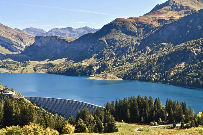 Ce barrage sera ma dernière étape de ce périple dans le Beaufortain. Sachant que les montagnes des alentours approchent les 2800 mètres, on peut comprendre qu'EDF ait trouvé ici un endroit idéal pour construire une retenue d'eau et produire ainsi de l'énergie hydroélectrique. Le complexe de Roselend La Bâthie (c'est son nom) comprend en fait le barrage de Roselend (ci-dessous) et deux barrages satellites, La Gittaz et Saint-Guérin. Celui de Roselend, réputé pour être le plus esthétique des barrages savoyards, nécessita 940 000 m3 de béton pour sa construction. Les travaux débuteront en 1955 pour une mise en eau cinq ans plus tard, engloutissant ainsi le village alpin de Roselend et donnant lieu au versement par EDF d'indemnités conséquentes aux habitants lésés, des subsides qui contribueront d'ailleurs à la naissance de la coopérative laitière de Beaufort. Avec l'achèvement des travaux en 1962, la nouvelle chapelle de Roselend fut édifiée près du site du barrage. La chapelle d'origine, dédiée à Sainte Marie-Madeleine, fut, elle, engloutie lors de la mise en eau du barrage.