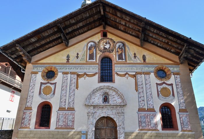 A Hauteluce, l'église vaut le détour. Venant tout juste d'être restaurée, celle-ci offre une façade ornée d'un superbe décor peint en trompe-l'oeil du 19è siècle (ci-dessous). Déjà existante au 12è siècle, cette paroisse dédia cette église à Saint-Jacques d'Assyrie, premier évêque de Tarentaise. L'édifice est par ailleurs doté d'un clocher à bulbe haut de 55 mètres et qui présente, lui aussi, un décor en trompe-l'oeil et abrite cinq cloches, dont la plus grosse pèse 2200 kg. A l'intérieur, on admire le retable majeur à baldaquins de style baroque et la chaire en bois sculpté, ornée des statues de Saint Paul, Saint Grégoire le Grand, Saint Jérôme et Saint Augustin, et classée elle aussi aux Monuments historiques.